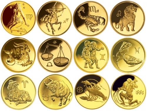 Золотые монеты Знак Зодиака (Овен, Лев, Стрелец, Рак, Скорпион, Рыбы, Телец, Дева, Козерог, Близнецы, Весы, Водолей).