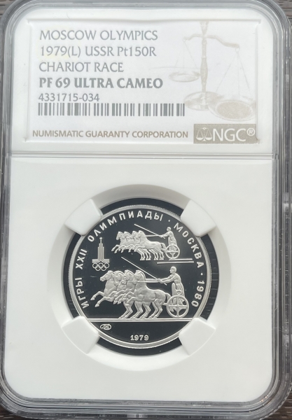 Слева и сверху вдоль канта слова «ИГРЫ XXII ОЛИМПИАДЫ», справа разделенные точкой слово «МОСКВА» и год проведения XXII Олимпиады «1980», сверху смещенная влево эмблема XXII Олимпийских игр, в середине гонки колесниц, ниже слева монограмма монетного двора «ЛМД», внизу у канта год выпуска монеты «1979».