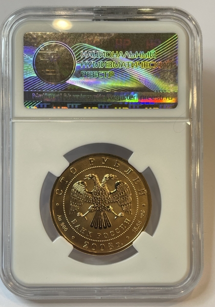 в центре диска - эмблема Банка России (двуглавый орел с опущенными крыльями, под ним надпись полукругом "БАНК РОССИИ"), обрамленная кругом из точек и надписями по кругу: вверху - "СТО РУБЛЕЙ", внизу - "2008 г.", слева - обозначение металла, проба сплава, справа - содержание драгоценного металла в чистоте и товарный знак монетного двора.