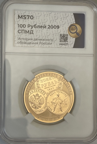 изображения трёх монет: вверху - серебряного рубля Николая I, слева - золотого империала Николая II, справа - золотого червонца советского чекана, по окружности - надпись: "ИСТОРИЯ ДЕНЕЖНОГО ОБРАЩЕНИЯ РОССИИ".