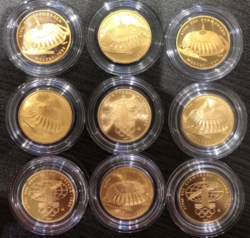 В 1977-1980 было выпущено шесть видов олимпийских монет из золота. Номинал монеты — 100 рублей, проба 900 (Au 900), вес — 17.45 г, диаметр — 30 мм, тираж 235 тыс. шт., монетные дворы: ЛМД, ММД. На лицевой стороне монеты изображение герба, на оборотной — олимпийские сооружения. Это первая монета СССР (с гербом СССР) чеканенная из золота, после длительного перерыва — легендарного золотого червонца РСФСР 1923 года