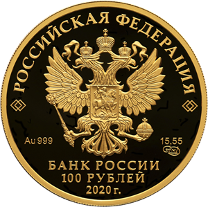 на зеркальном поле диска — рельефное изображение Государственного герба Российской Федерации, над ним вдоль канта — надпись полукругом: «РОССИЙСКАЯ ФЕДЕРАЦИЯ», обрамленная с обеих сторон сдвоенными ромбами, внизу под гербом: слева — обозначения драгоценного металла и пробы сплава, справа — содержание химически чистого металла и товарный знак монетного двора, внизу в центре в три строки — надпись: «БАНК РОССИИ», номинал монеты: «100 РУБЛЕЙ», год выпуска: «2020 г.».