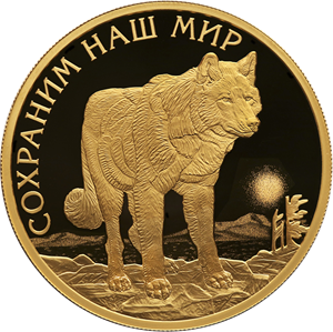 на зеркальном поле диска — рельефное изображение полярного волка на фоне изображений водной поверхности, скал и солнца; слева вверху вдоль канта — надпись: «СОХРАНИМ НАШ МИР».