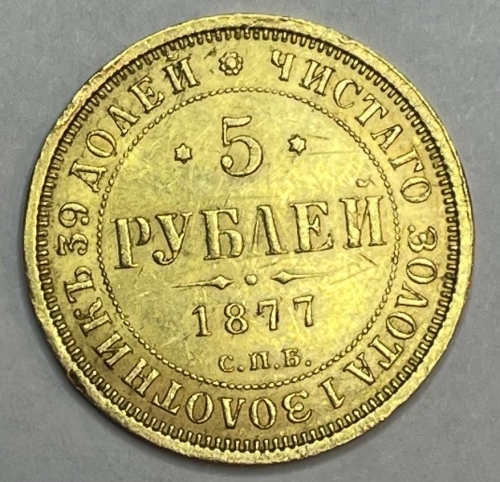 В центре указан номинал «5», ограниченный с обеих сторон шестиконечными звездочками. Под цифрой номинала — слово "РУБЛЕЙ". Ниже, расположен декоративный разделитель в виде двух разнонаправленных фигурных линий и небольшой выпуклой точки между ними. Под разделителем — дата выпуска монеты «1877». Под цифрой даты — обозначение монетного двора «С.П.Б.». Центральная часть отделена от остального изображения, окружностью в виде точек. За окружностью круговая надпись: «ЧИСТОГО ЗОЛОТА 1 ЗОЛОТНИК 39 ДОЛЕЙ», разделенная сверху цветочной розеткой. По окружности канта имеются рельефные элементы, выполненные в виде зубцов.