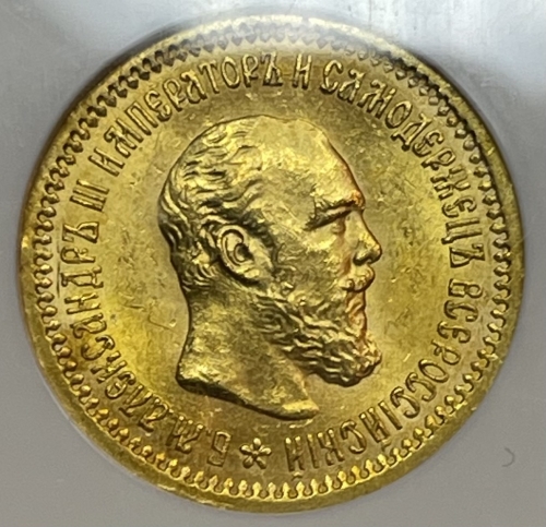 В центре изображен Малый Государственный Герб Российской империи - двуглавый орёл, головы которого увенчаны двумя коронами, третья, большая корона над ними. Все они соединены орденской лентой ордена Св. апостола Андрея Первозванного. На груди орла расположен Московский герб - щит с изображением Георгия Победоносца с копьём поражающего дракона. Вокруг щита цепь ордена Св. апостола Андрея Первозванного. На крыльях изображены гербы: Царства Казанского, Польского, Херсонеса Таврического, Астраханского, Сибирского, Грузинского и герб соединенных княжеств Киевского, Новгородского и Владимирского — по 4 на каждое крыло. В правой лапе орла – скипетр, в левой – держава. Под ним слева направо изображены: номинал - надпись «5 РУБЛЕЙ» и дата выпуска «1889 Г.». По окружности канта имеются рельефные элементы, выполненные в виде зубцов.