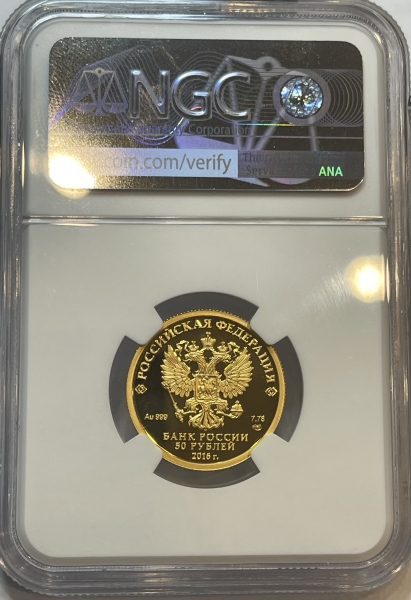на зеркальном поле диска – рельефное изображение Государственного герба Российской Федерации, над ним вдоль канта – надпись полукругом: "РОССИЙСКАЯ ФЕДЕРАЦИЯ", обрамленная с обеих сторон сдвоенными ромбами, внизу под гербом: слева – обозначения драгоценного металла и пробы, справа – содержание химически чистого металла и товарный знак монетного двора, внизу в центре в три строки – надпись: "БАНК РОССИИ", номинал монеты: "50 РУБЛЕЙ", год выпуска: "2016 г.".