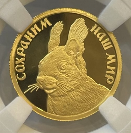рельефное изображение белки; слева и справа по окружности – рельефная надпись «СОХРАНИМ НАШ МИР».