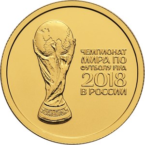 рельефное изображение Кубка Чемпионата мира по футболу FIFA, справа – надпись в пять строк: "ЧЕМПИОНАТ МИРА ПО ФУТБОЛУ FIFA 2018 В РОССИИ".