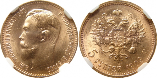В 1909 году, после небольшого перерыва, пятирублевая монета чеканилась Санкт-Петербургским монетным двором из золота 900 пробы. Сегодня стоимость такой золотой монеты зависит от стоимости металла, из которого она выполнена, её состояния и сохранности. Монета 1909 года встречается реже других, поэтому её цена заметно выше аналогов других годов. Также известна редкая разновидность этой монеты с гладким гуртом.